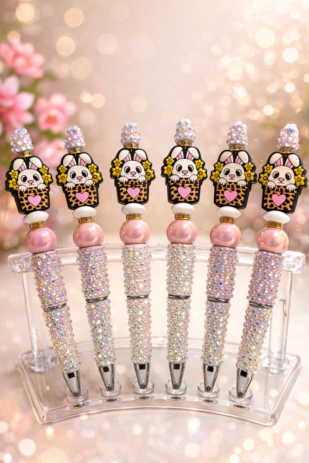 Add a little sparkle to your day with our Leopard Luxe Bunny Bling Pen! Featuring an adorable bunny nestled in a chic leopard-print basket with floral accents and a sweet pink heart, this pen is topped with a dazzling rhinestone crown. The handle is fully wrapped in iridescent rhinestones for maximum glam and shine β¨ Perfect for planners, journals, office desks, teacher gifts, Easter baskets, or anyone who loves cute + classy sparkle!