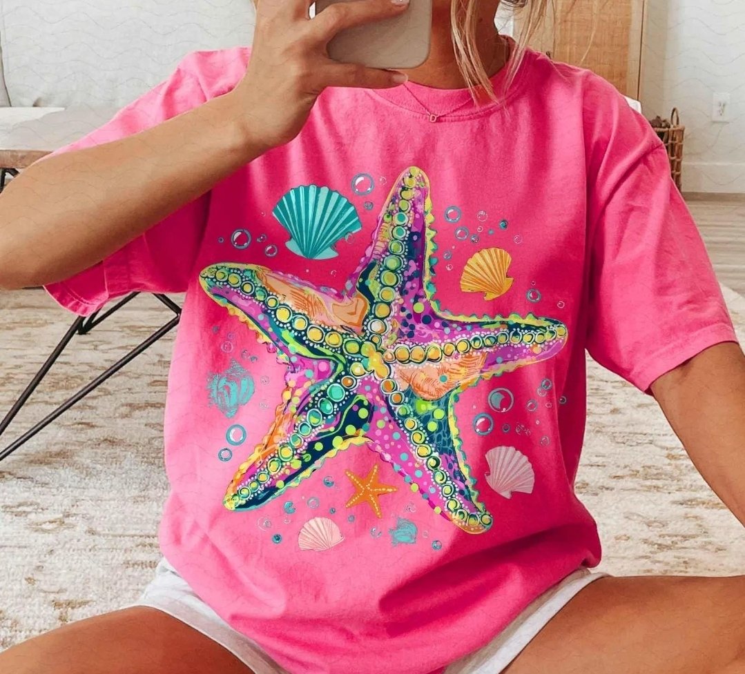 Bright, beachy, and full of personality—this vibrant starfish design pops with bold colors, playful bubbles, and seashell accents. Perfect for summer days, beach trips, or adding a fun coastal vibe to your everyday style.