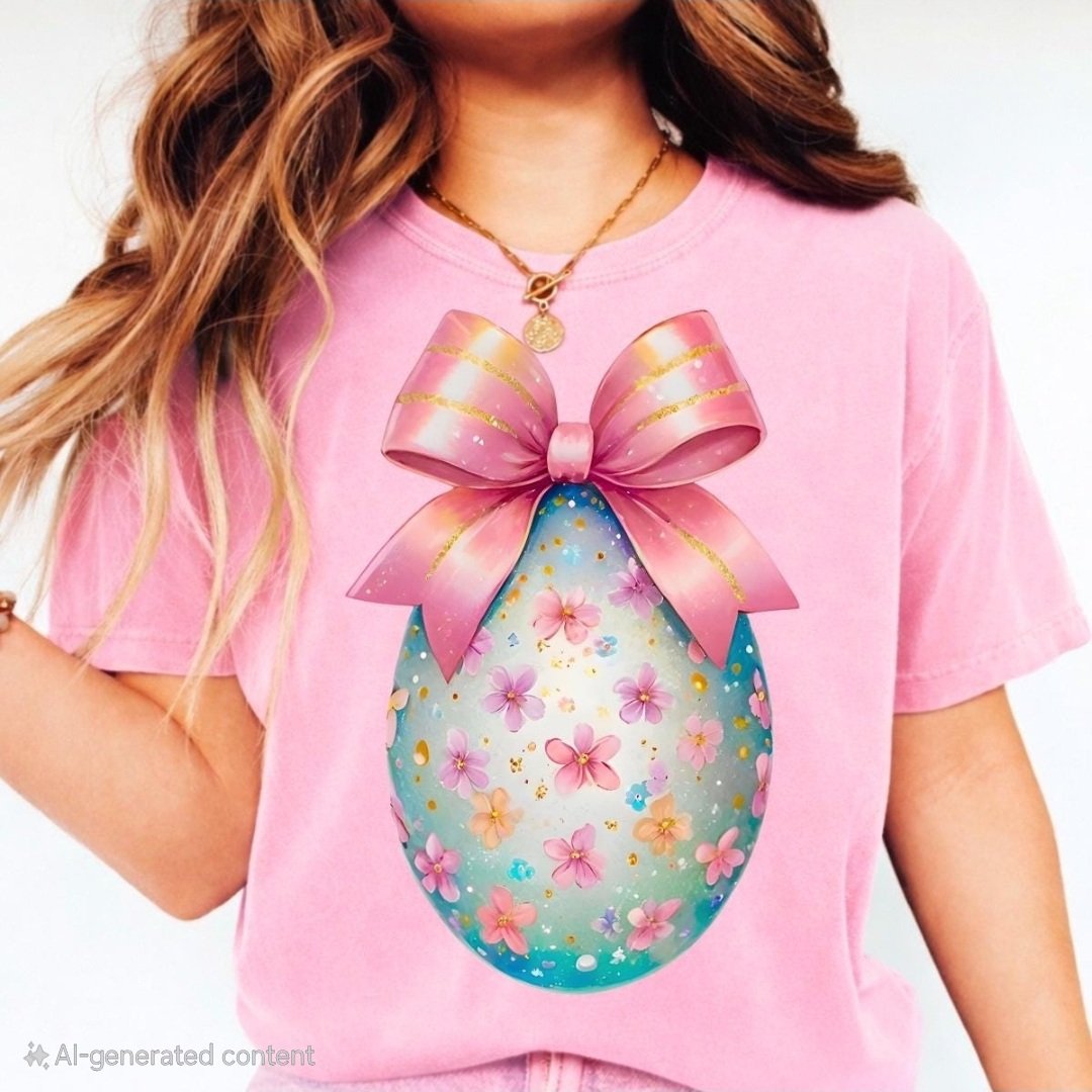 Charming spring tee featuring a beautifully decorated floral Easter egg topped with a soft pink bow. A sweet and festive design perfect for Easter celebrations, spring outings, and adding a touch of pastel charm to your wardrobe.